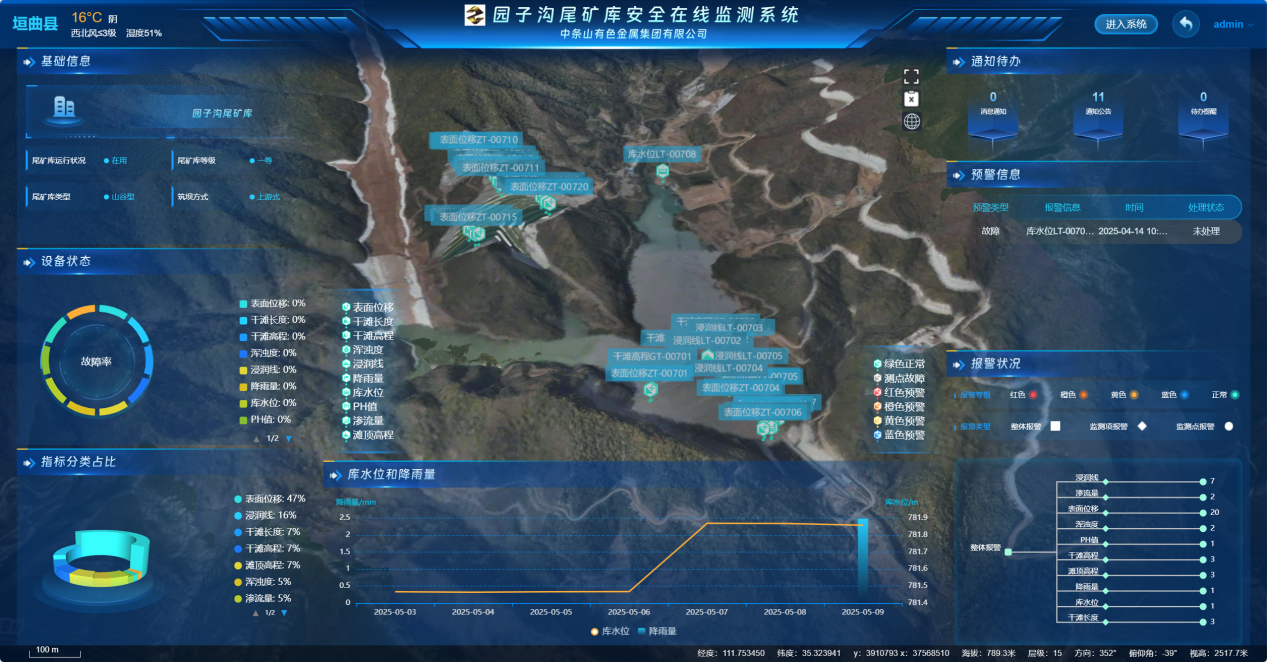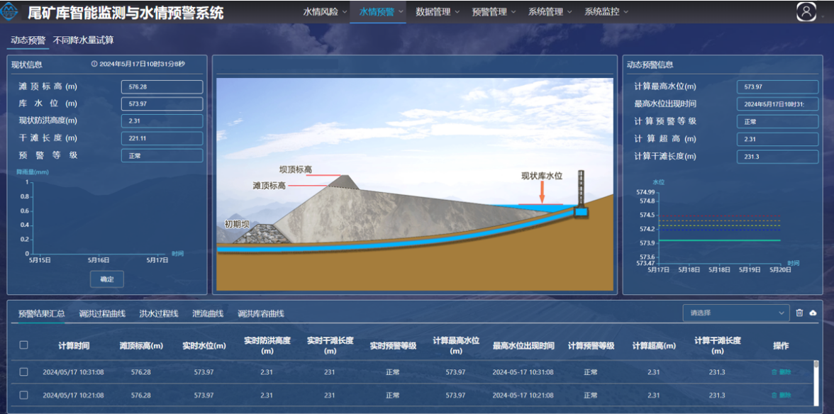 适用于金属非金属尾矿库,实时水情预警时间<2s,水情预测预报时间提前10天,在线监测数据有效性提高20%,预警准确率提高至70%。