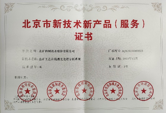 图1 选矿在线激光光谱分析系统示意图   图2 北京市新技术新产品认定证书